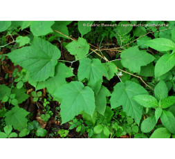 Superbe arbuste aux tiges grises et en zig-zag portant de grandes feuilles caduques, lobées et peltées, d'où son nom. Elles peuvent atteindre 20 cm...