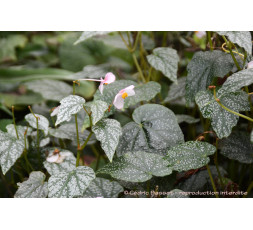 Bégonia originaire d'Asie (Chine, Himalaya, Thaïlande, Vietnam) aux feuilles allongées, vert clair avec des marques allongées blanches. Fleurs...