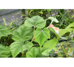 Superbe arbuste aux tiges grises et en zig-zag portant de grandes feuilles caduques, lobées et peltées, d'où son nom. Elles peuvent atteindre 20 cm...