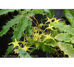 'Tarantula' est une belle variété aux feuilles persistantes, étroites, allongées, vert brillant, dentées et ondulées sur les bords. Au printemps, belle floraison jaune vif. Une plante avec un beau port, résistante au sec. Hauteur adulte de 30/40 cm pour 40/60 cm de large.